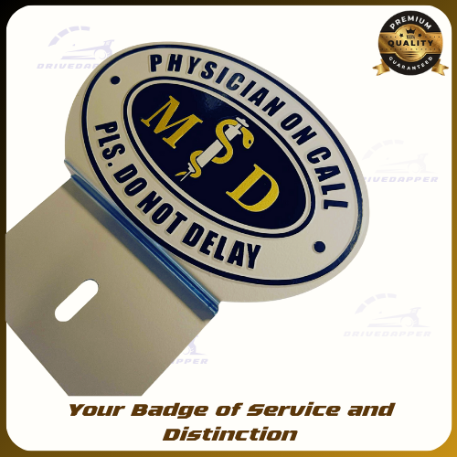 Expertly crafted from high-grade, rust-resistant metal, it showcases the classic MD insignia and Caduceus symbol on a refined silver and black finish. The bold “PHYSICIAN ON CALL – PLS. DO NOT DELAY” lettering ensures visibility and recognition wherever you go.