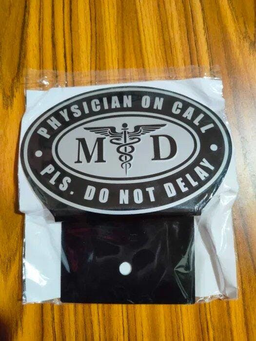Expertly crafted from high-grade, rust-resistant metal, it showcases the classic MD insignia and Caduceus symbol on a refined silver and black finish. The bold “PHYSICIAN ON CALL – PLS. DO NOT DELAY” lettering ensures visibility and recognition wherever you go.