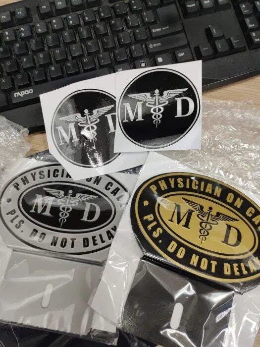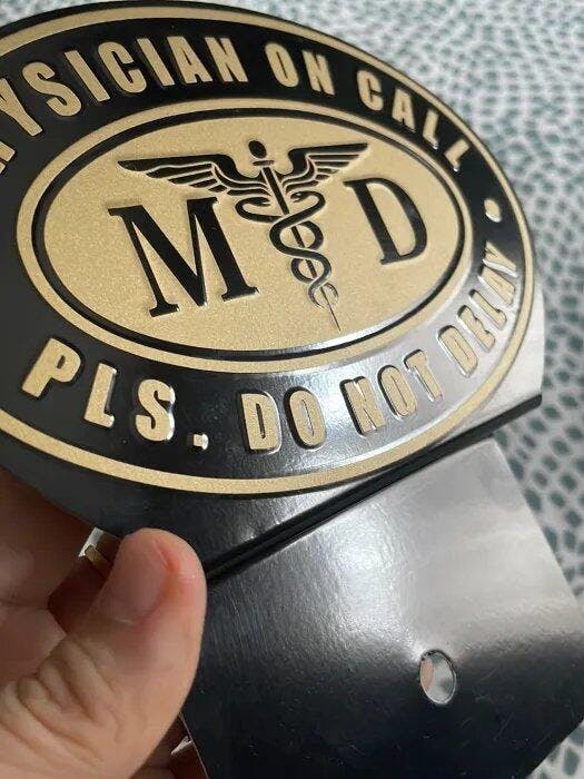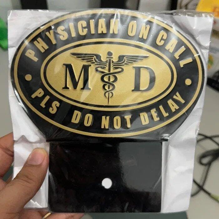 Expertly crafted from high-grade, rust-resistant metal, it showcases the classic MD insignia and Caduceus symbol on a refined silver and black finish. The bold “PHYSICIAN ON CALL – PLS. DO NOT DELAY” lettering ensures visibility and recognition wherever you go.