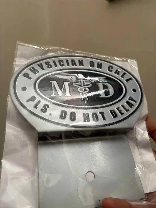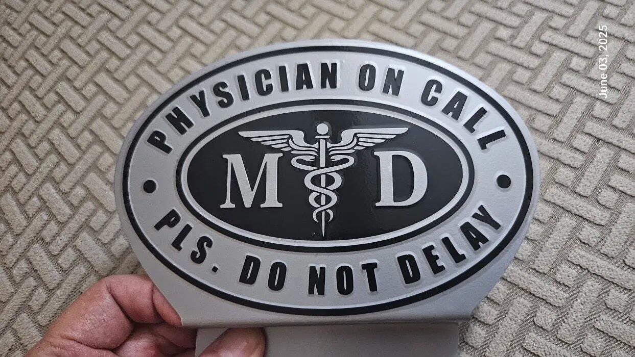 Expertly crafted from high-grade, rust-resistant metal, it showcases the classic MD insignia and Caduceus symbol on a refined silver and black finish. The bold “PHYSICIAN ON CALL – PLS. DO NOT DELAY” lettering ensures visibility and recognition wherever you go.